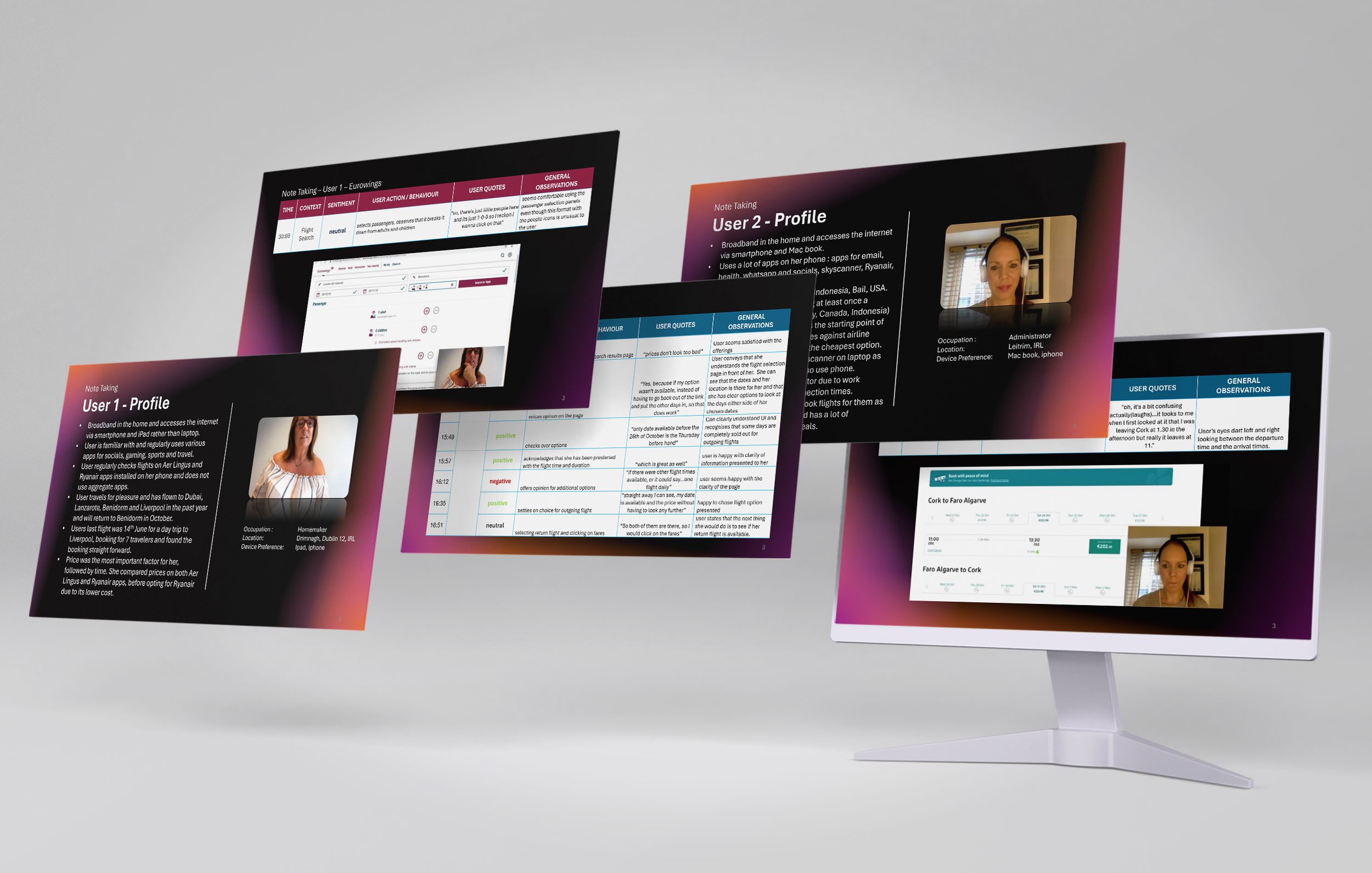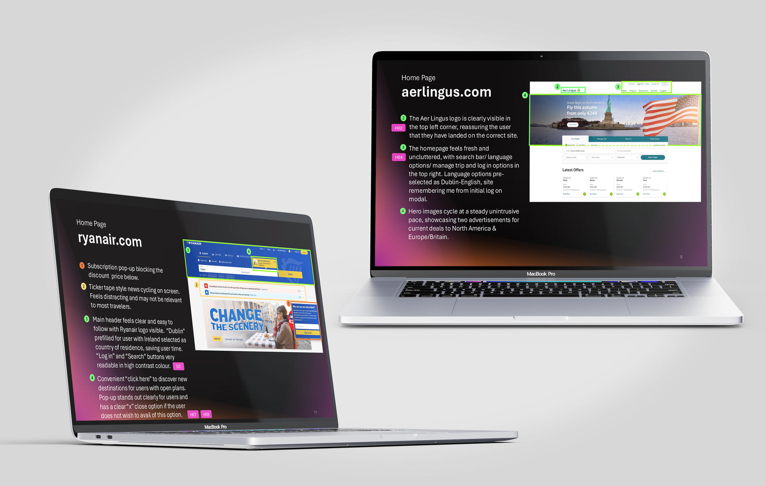 As Fly Mór is a conceptual website developed from scratch, this phase of research focused on analyzing competitor platforms to inform its design. I conducted independent usability tests on Aer Lingus and Eurowings, and reviewed two additional tests carried out prior to my research, resulting in a total of three participants and four airline websites evaluated.