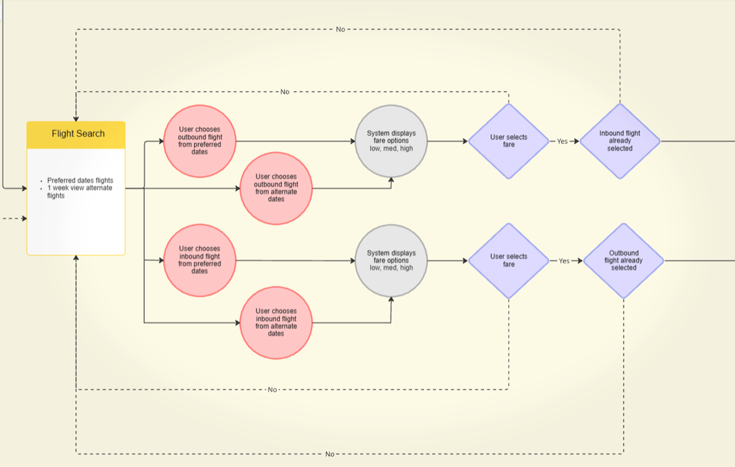 The flow diagram resolved key user pain points identified in the customer journey map and affinity diagram. In this early design phase, I mapped the user’s ‘happy path’ through the Fly Mór website—from the homepage to the booking summary—with the goal of creating a seamless, intuitive, and frictionless experience.