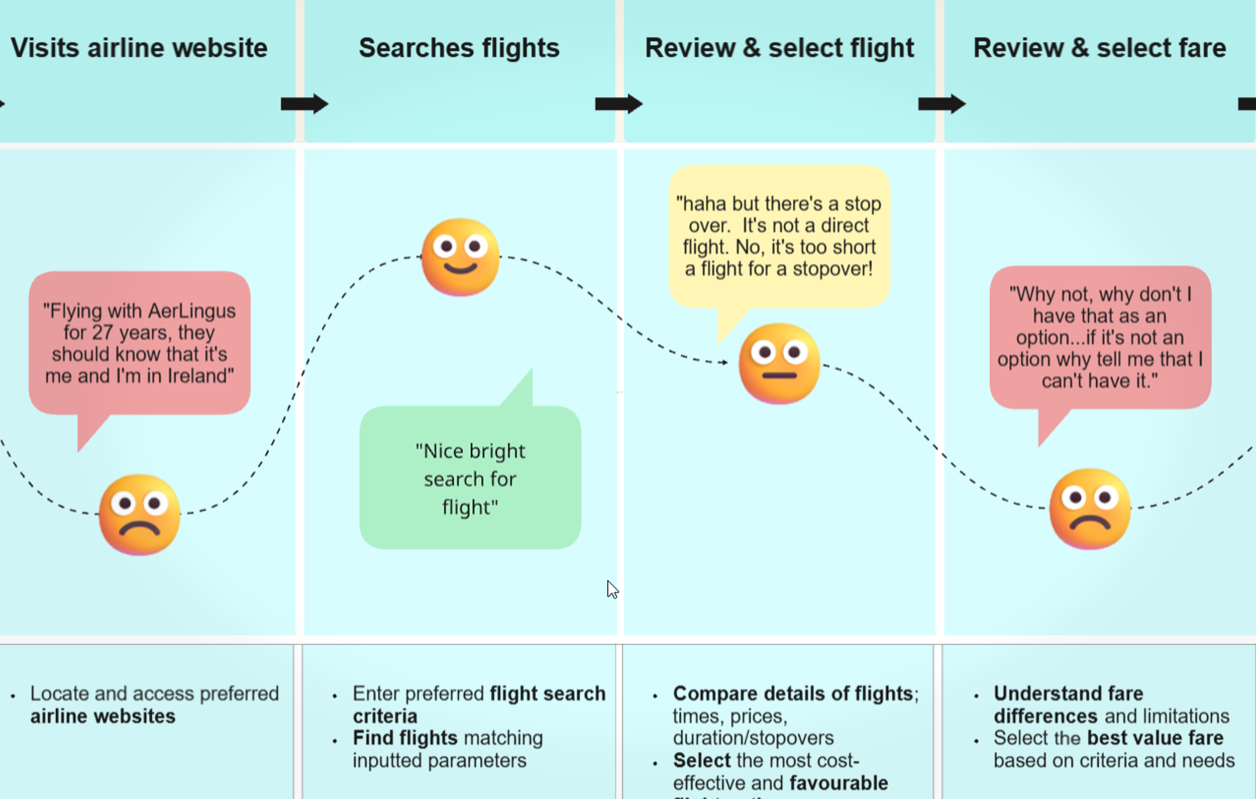 This visual mapping of the average user journey, developed from my research findings, provided deep insight into each stage of the flight booking process. By consolidating all data, I was able to analyze every step of the journey to identify how Fly Mór could deliver a more seamless and user-centered experience. Each stage explored users’ goals, behaviors, actions, mental models, positives, pain points, and opportunities. To further illustrate these insights, direct quotes from usability tests were incorporated to capture authentic user sentiments.